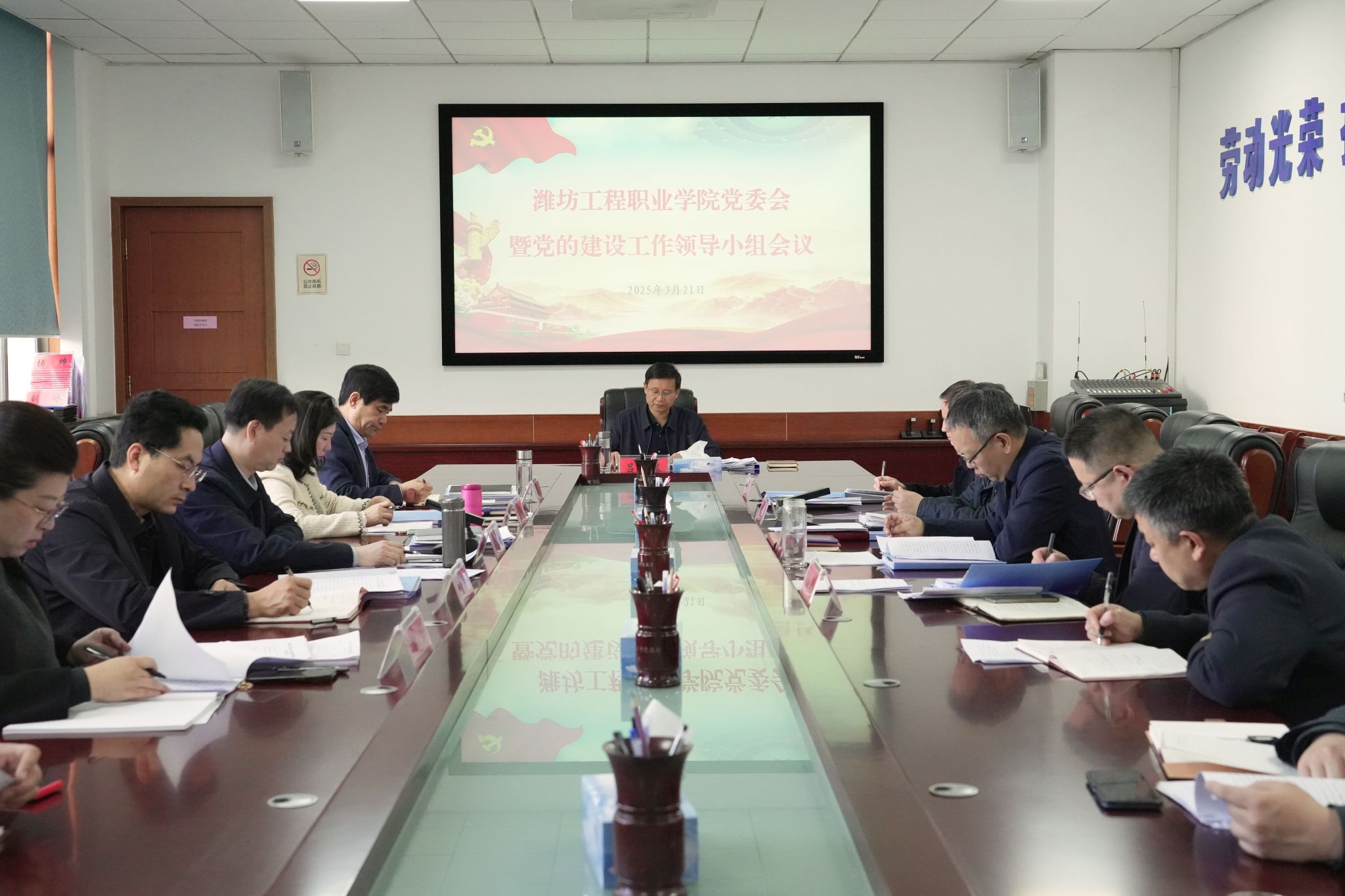 3月21日,学院在海岱阁220会议室召开党委会暨党的建设工作领导小组会议,传达学习中央、省市委党的建设工作领导小组有关会议精神,研究部署学院深入贯彻中央八项规定精神学习教育工作。党委书记吕尧良主持会议并讲话,学院领导出席会议。各党总支(支部)书记参加会议。